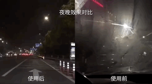 效果对比,使用除油膜剂之前油污炫光严重,清洗过以后干净通透,视野开阔。