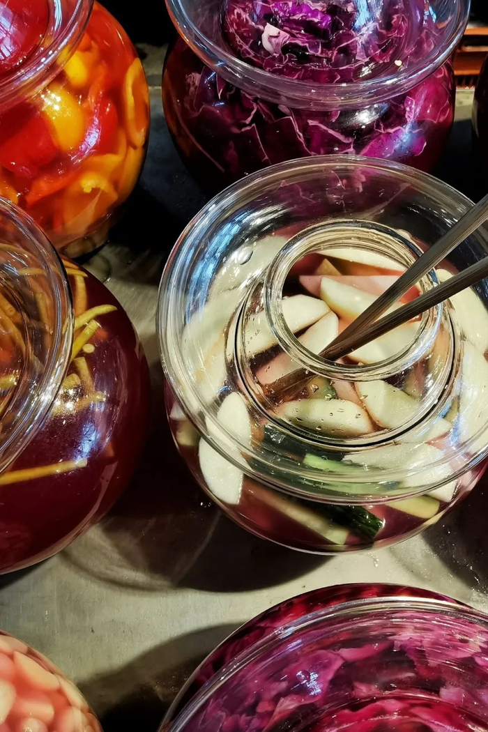 在广西,几乎所有水果都能做成酸野(一种广西独有的、用新鲜蔬果腌制而成的酸味小吃),木瓜、芒果、苹果、杨桃、李子,切成条切成块,或者囫囵塞进坛中,用醋、辣椒、盐腌个彻底,爽脆的口感与直击心灵的酸承包了所有广西人关于街头小吃的回忆。