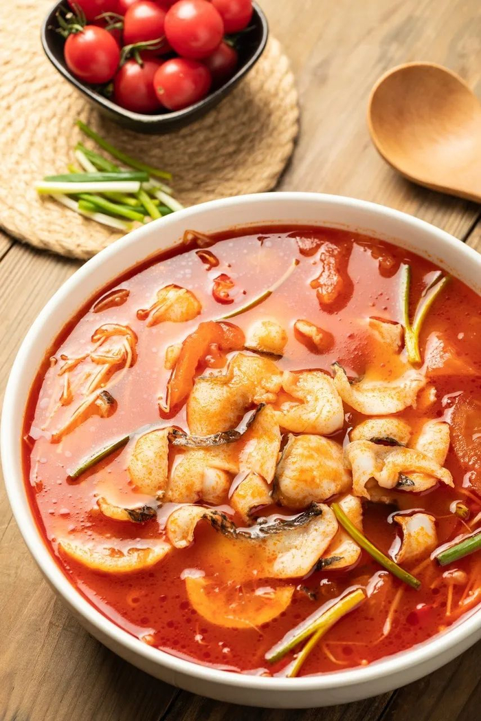 贵州的酸汤有红、白之分。毛辣果(当地特有的野生小番茄)熬出的“红酸汤”,酸爽透亮,色泽红润,番茄一定要挑熟透的,籽要多、水分要轻,这样熬出来的酸汤才足够酸香浓郁。