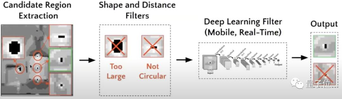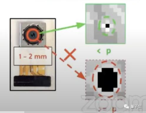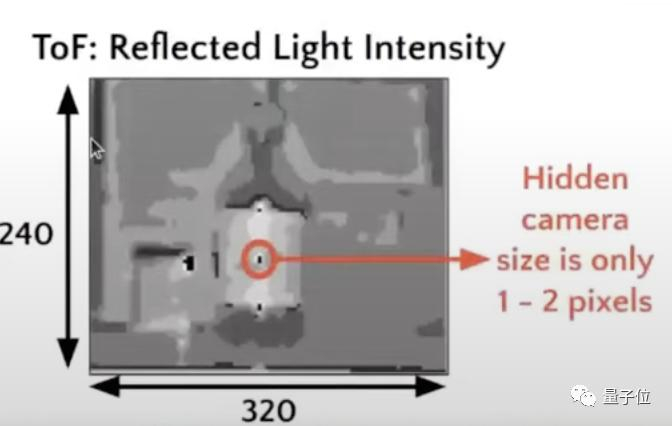 那就好办了,就比如下图最右,通过适当距离的ToF传感器反射,我们可以发现四个高亮点,而其中一个就是针孔摄像头藏身之处。