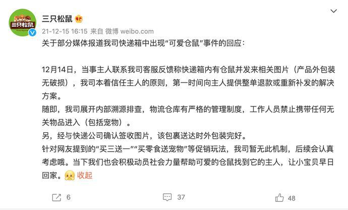 12月5日,三只松鼠微博发布消息,内容如下。