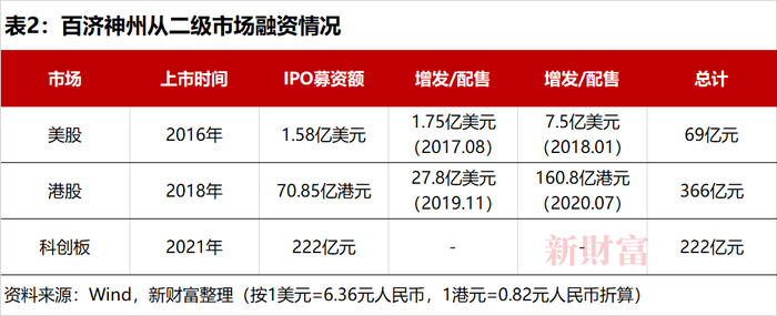 截至目前,百济神州在港股市场的融资额度最高,达366亿元;其次是科创板市场,为222亿元,美股市场仅融资不到70亿元。百济神州从三大市场总募资额超650亿元,加上其在一级市场募得12.2亿元,总计直接募资金额超669亿元(表2)。