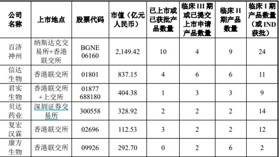 这也使得其研发成果具有相对优势,招股书中,百济神州已上市或已获批产品数量达10种,信达生物仅有4种;临床II期产品数量以及临床I期产品数量分别为9种、24种,均高于可比公司(表9)。