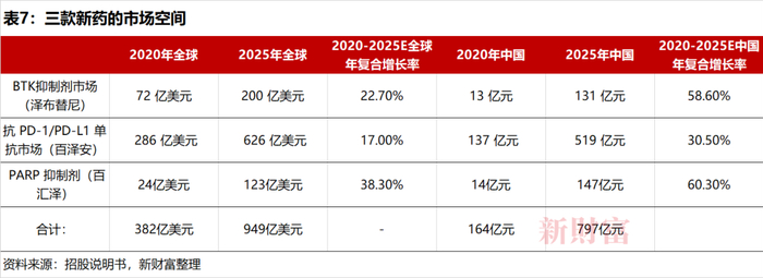 预计到2025年,百泽安、百悦泽、百汇泽的全球市场空间合计将达到近千亿美元,而在中国市场2020-2025年的预期复合增速将分别达到30.5%、58.6%、60.3%,高于全球市场增速(表7)。百济神州5年后能在这千亿美元市场中拿到多少份额呢?