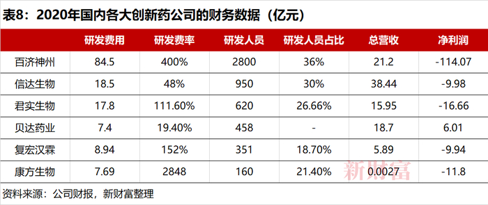 2020年,信达生物研发支出为18.5亿元、君实生物研发费用达17.8亿元、贝达药业研发费用为7.4亿元、复宏汉霖研发费用为8.94亿元,研发费率分别为48%、111.6%、19.4%、152%。值得一提的是,康方生物由于营收过于薄弱,研发费率高达2848倍(表8)。