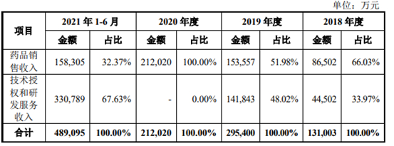 百济神州的主营业务包含药品销售收入、技术授权和研发服务收入。2021年1-6月,其药品销售收入达15.8亿元,占比32%,而技术授权和研发服务收入占比高达68%(表5)。