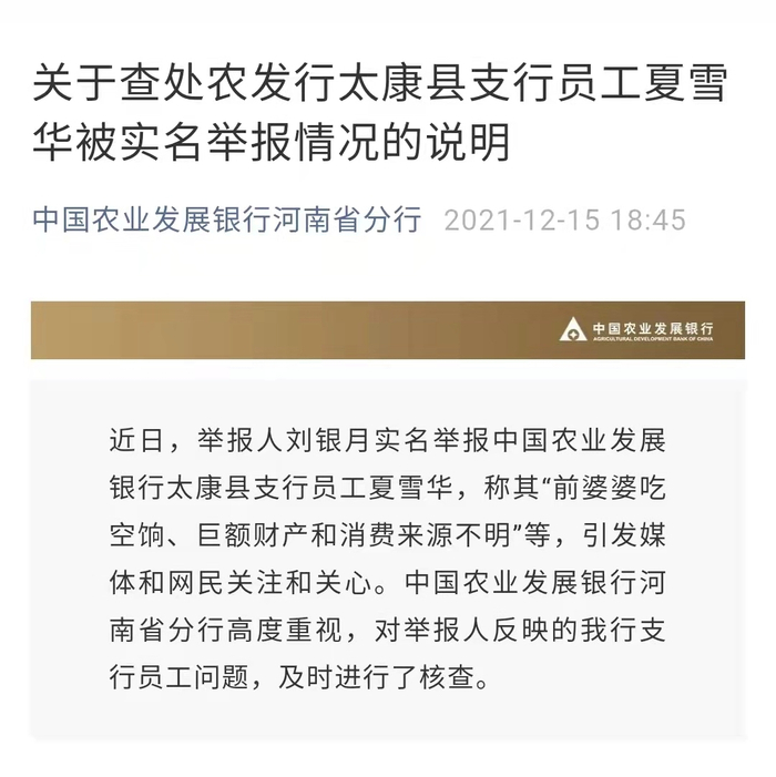 中国农发行河南省分行微信公众号12月15日消息,近日,举报人刘银月实名举报中国农业发展银行太康县支行员工夏雪华,称其“前婆婆吃空饷、巨额财产和消费来源不明”等,引发媒体和网民关注和关心。中国农业发展银行河南省分行高度重视,对举报人反映的我行支行员工问题,及时进行了核查。