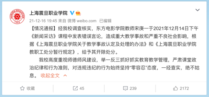 12月16日晚,上海震旦职业学院通报,经校方调查核实,东方电影学院教师宋庚一于2021年12月14日下午《新闻采访》课程中发表错误言论,造成重大教学事故和严重不良社会影响,根据《上海震旦职业学院关于教学事故认定及处理的办法》和《上海震旦职业学院教职工处分暂行规定》,给予其开除处分。