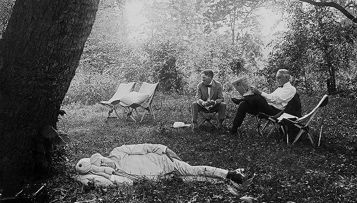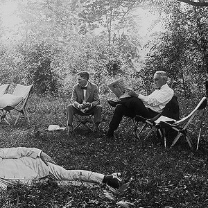 1921年7月19日,爱迪生在马里兰州的一棵树下小憩,沃伦·G·哈丁总统坐在马扎上读报,身旁是实业家哈维·费尔斯通。图片来源:Everett Collection Inc/Alamy Stock Ph
