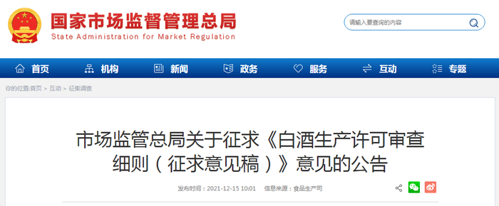 市场监管总局关于征求《白酒生产许可审查细则(征求意见稿)》意见的公告