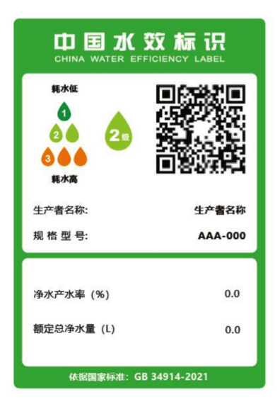 《净水机水效标识实施规则》覆盖的产品范围是以市政自来水或其他集中式供水为原水,以反渗透膜或纳滤膜作为主要净化元件,供家庭或类似场所使用的小型净水机。净水机水效标识标注的主要信息包括生产者、产品规格型号、水效等级、净水产水率、额定总净水量等。净水机水效等级依据国家标准《净水机水效限定值及水效等级》(GB34914-2021)确定。