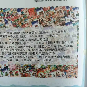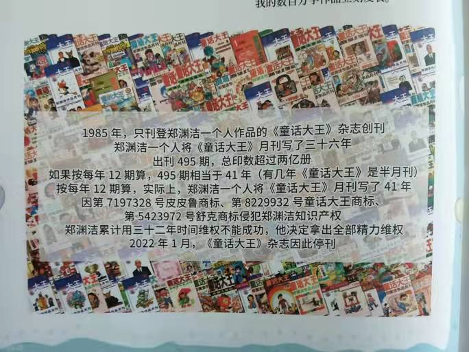 澎湃新闻:能否介绍下决定《童话大王》休刊的真实原因?郑渊洁:商标侵权困扰我二十多年了,“解决不了,看不到不希望”。做出停刊决定也是不得已,从我70年代末开始写作发表童话作品,但创办《童话大王》,其实是见证了中国改革开放四十多年知识产权保护的进程。知识产权主要就是三部分组成,著作权、专利权、商标权。著作权这部分,我们国家取得了长足的进步,从刚开始维权举证的艰难,到现在我打一个举报电话,就可以让不法的盗版书商判刑。仅仅是去年,就判刑了11个盗版盗印我作品的不法书商。专利权保护也有不小的进步,唯独是商标权的保护,坦白讲,现状不能令人满意。澎湃新闻:在你看来,商标权保护的难点在哪里?郑渊洁:我想原因可能是关注的人还是少,另外关注这个问题的人可能会去找代理公司,代理公司一般是以营利为目的,它们把环节和流程拖得越长,利润越高。我一开始也是找代理公司,后来发现不对头,就开始亲力亲为研究这事儿。到目前为止有672个侵犯我知识产权的商标,他们用我原创的知名童话人物名称,皮皮鲁鲁西西,舒克贝塔,还有篇名如《魔方大厦》《罐头小人》《309暗室》《五个苹果折腾地球》抢注商标。