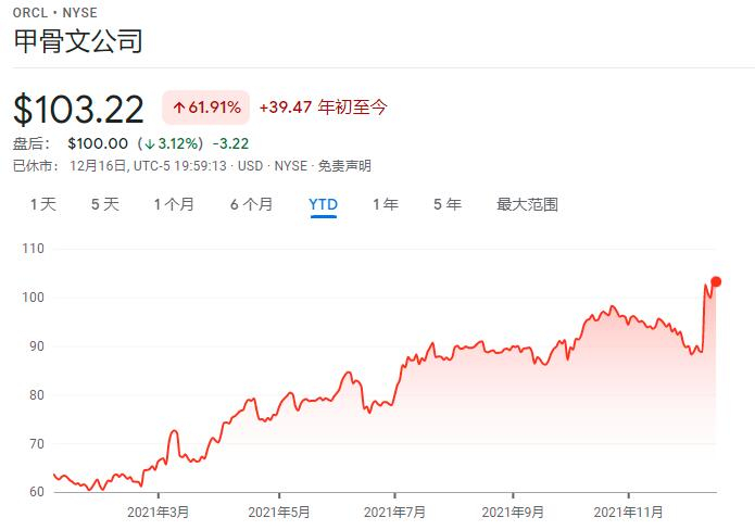 甲骨文股价周四收于103.22美元,在科技股普遍遭遇抛售的情况下仅略有下跌,此前一日该公司股价刚刚创下历史高位。
