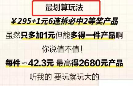与消费者李先生、钱女士不同,王女士是朋友分享给她拆盲盒活动的链接,并告诉她分享3个好友参与活动后可以再次免费拆一个盲盒。为了助力好友,在仔细浏览活动页面后,她支付了296元参与拆盲盒活动,但拆到的7个奖品中有一半都不是自己想要的。于是她在未发货的情况下向客服申请退款,客服以“非质量问题不退不换”为由拒绝。王女士指着活动页面中的“最划算玩法 295+1元6连拆必中二等奖奖品”,对记者说:“我就是看到这句话觉得很划算才花钱玩的。”