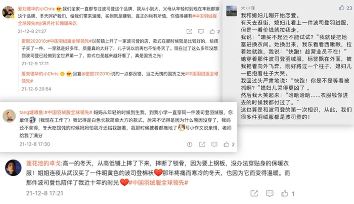 在《我和波司登的故事》征集中,许多人提到,人生中的第一件羽绒服就是波司登。“小时候没有羽绒服,棉衣都是妈妈给做的,不像现在的小朋友有好的条件,我们那时候上小学或初中穿的是妈妈做的棉袄,上高中的时候穿的是棉服,直到上大学才买了第一件波司登羽绒服。现在毕业了,工作了,也结婚了。但是我还记得我人生的第一件波司登羽绒服,现在我也经常穿这个牌子,双11给我自己和妈妈选购了波司登。”