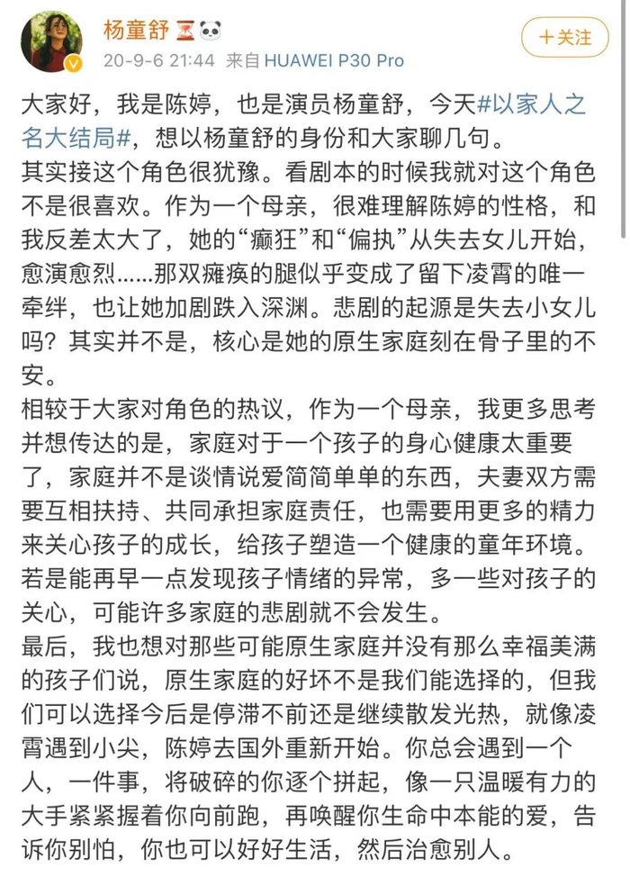 观众对陈婷恨得牙痒痒,杨童舒在《以家人之名》大结局当天也发长文坦言:“看剧本的时候,我对这个角色不是很喜欢。”但她希望通过角色传达家庭对于一个孩子身心健康的重要性,夫妻双方都要用更多的精力来关心孩子的成长,给孩子塑造一个健康的童年环境。