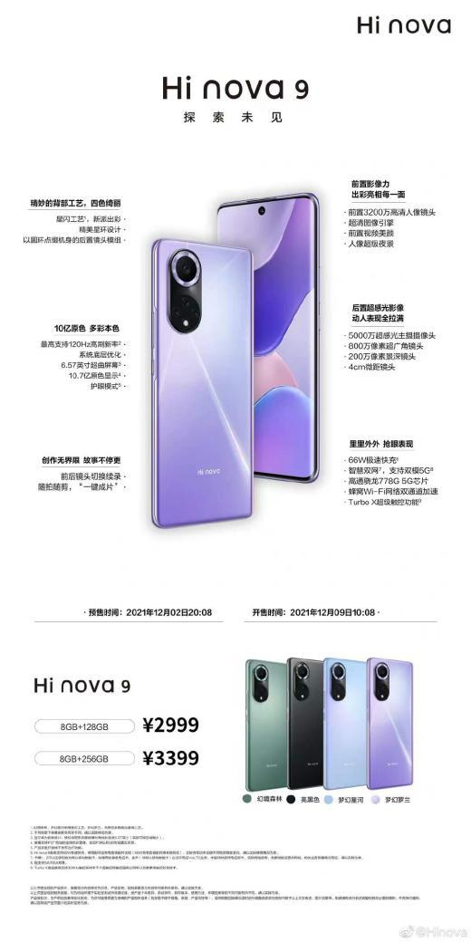 Hi nova 9 系列拥有 4 款梦幻配色:幻境森林、梦幻罗兰、梦幻星河和亮黑色。