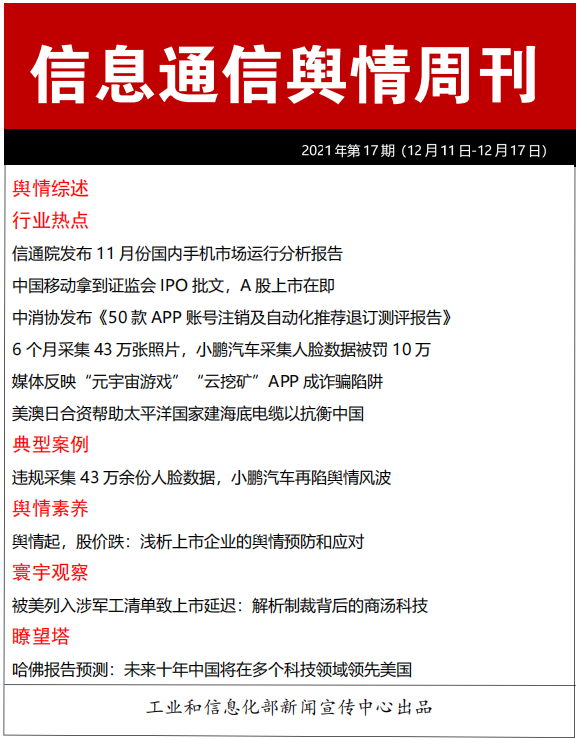 《信息通信舆情周刊》由工业和信息化部新闻宣传中心主办,每周一期,全年共计50期。分为纸质版和网络版,包括【舆情综述】、【行业热点】、【典型案例】、【舆情素养】、【寰宇观察】、【瞭望塔】等栏目。