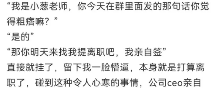 随后,花名为“小葱老师”的内部高层也下场表示:“公司疫情期间,一个月亏2000多万,你回我一句话那我活该,真是打一手好感同深受。”据悉,茶颜悦色创始人吕良在内部的花名为“小葱”。