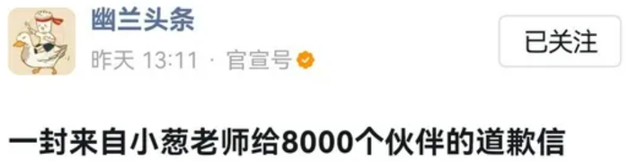 17日下午,茶颜悦色方面向媒体表示,吕良已就内部薪资争吵发道歉信,称“对不住8000位信任公司、一起努力想办法扛住这个冬天的伙伴……事先没有把薪资调整的原因和调整后的薪资计算方式跟大家讲清楚。”