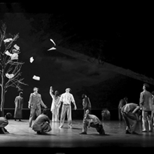 紧接着,“大海”“洪流”“故土”,一幕幕高度意象化的场景再现了冼星海颠沛流离、同时与国家命运紧密相连的壮丽人生:渔家出身、海外求学、立志音乐救国、创作《黄河大合唱》、流落异乡归国无门……最终,冼星海心灵世界的化身“命运”一角拿走他手中的笔,舞台上空悬挂的巨型装置转动走向零点,音乐家的生命走向尽头。