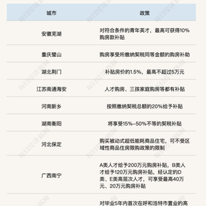 安徽芜湖,对符合条件的青年英才,最高可获得10%购房款补贴;广东惠州,符合条件的人才公积金贷款额度不受缴存余额限制。