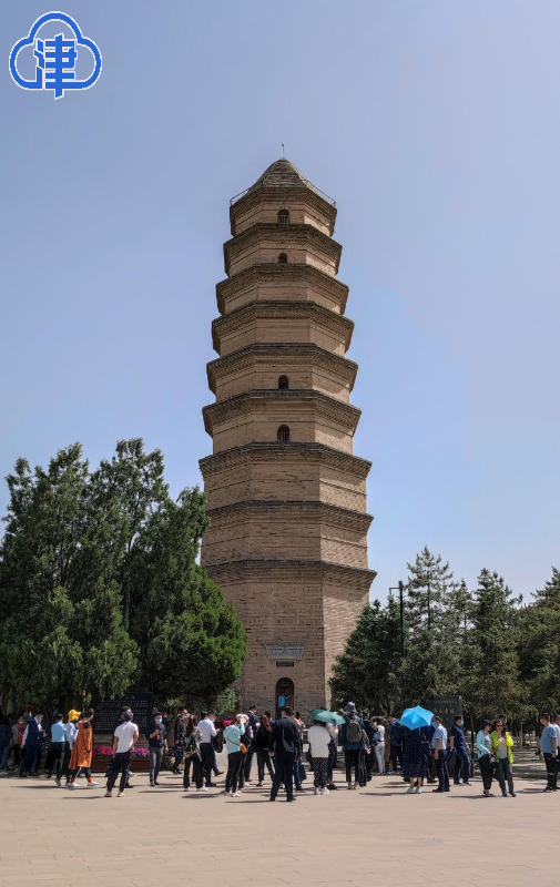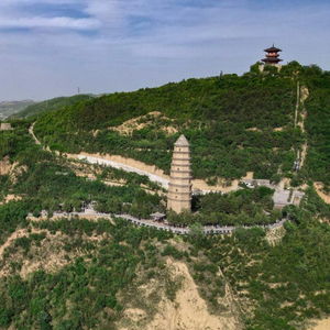 沿着蜿蜒的盘山道登临宝塔山,临向延河的一侧山风呼啸,而背面却风和日丽。宝塔山海拔高度1135.5米,山上宝塔始建于唐朝,现为明朝建筑,宝塔是平面八角形楼阁式九层砖塔,高约44米。