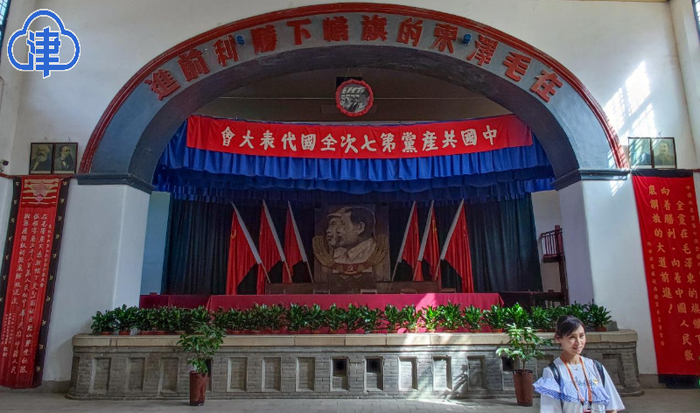 礼堂内部的陈设还是当年“中共七大”召开时的模样:11排长椅整齐摆放着,主席台中央有毛泽东、朱德的巨幅画像,靠墙插着24面红旗,象征着中国共产党自成立以来走过的24年历程。