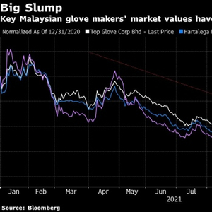 今年迄今为止,全球最大手套厂商——顶级手套(Top Glove Corp.)下跌了超60%,而去年该股票曾一度暴涨6倍多;速柏玛(Supermax Corp.)今年下挫超74%,而去年该股票一度暴涨15倍以上。