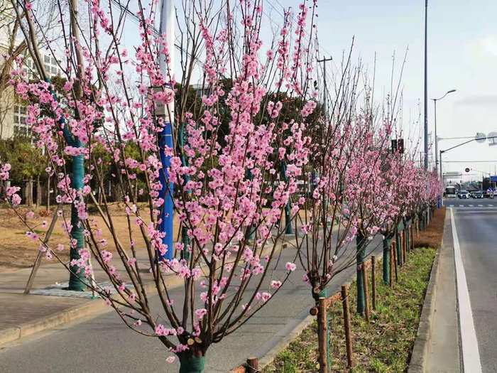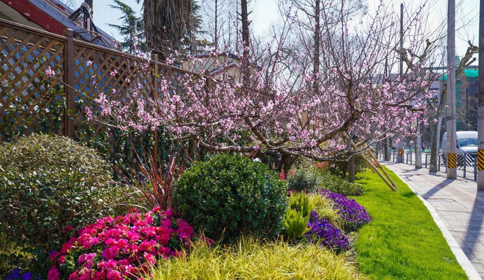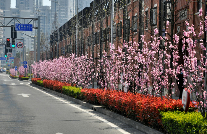 徐汇龙华(西)路:两侧为桃花景观,采用果桃和花桃混种的形式,桃花次第绽放,色彩浓淡相宜。采用木本、宿根和草本相结合的原则搭配种植。同时提升灌木地被的品质,选用多种玉簪作为该道路的主题开花植物。最佳观赏期为3~4月。