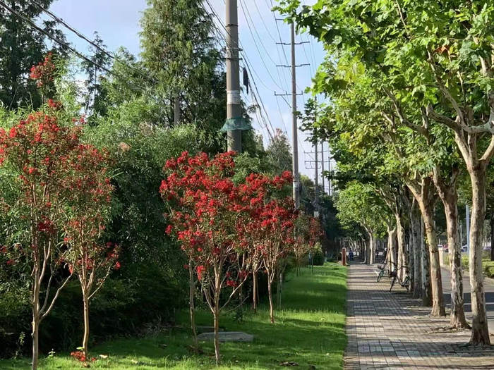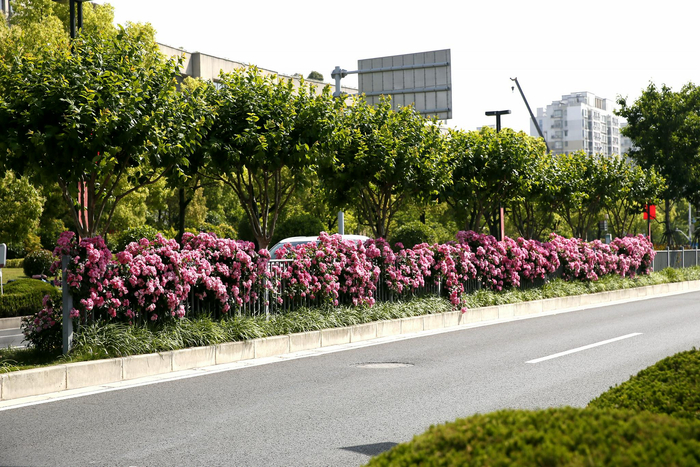 嘉定新成路:道路东侧为绿化带,西侧为居住区和绿化带,中间为两条机非绿化隔离带。引入“天鹅绒”紫薇作为特色品种;丰富植物的色彩,既保持了现有的生态功能,又新增视觉观赏、娱乐休闲等功能,打造了四季有景的特色景观。最佳观赏期为6~9月。