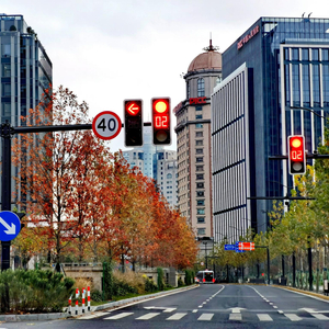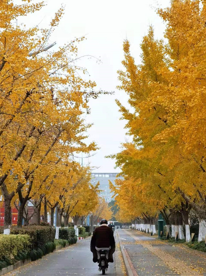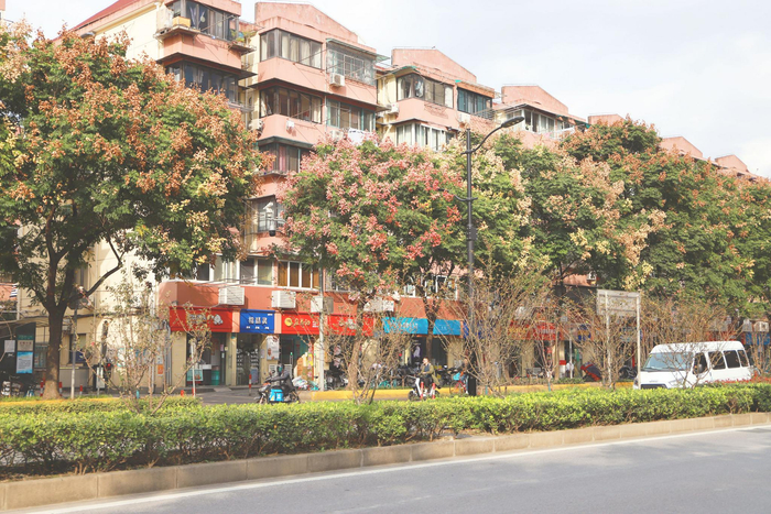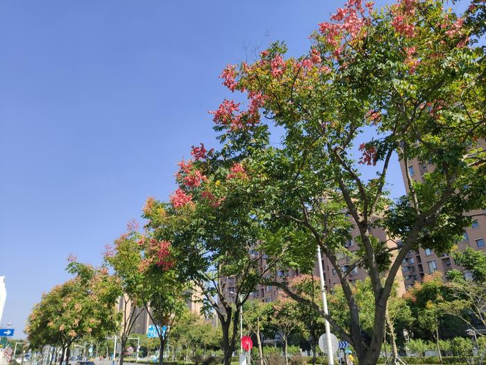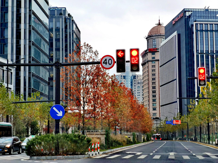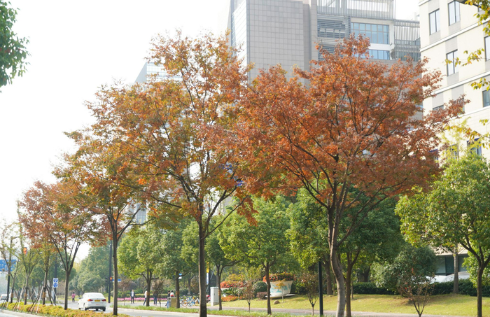 黄浦区中山南路,一到秋天便是五彩斑斓的大道。宽敞的马路两旁种植着悬铃木,中分带绿化乔木为娜塔栎,人行道两侧则布置有无患子,娜塔栎的橙红、法桐的黄绿以及观赏草的色彩交相呼应,构成独特的秋季彩叶大道。