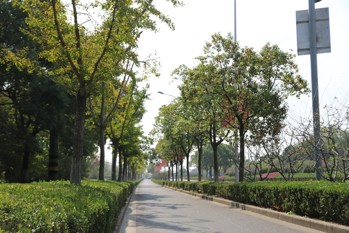 浦东中科路:中隔带的枫香树、榉树形成连续的秋色叶景观特色道路,下木规则式种植火焰南天竹并用石蒜镶边。机非隔离带行道树为香樟,下木对称种植德国鸢尾及紫娇花,中层美人梅点缀其中,两边绿地内北美海棠与各路口景观交相呼应,繁花似锦。最佳观赏时期为3~5月,10~11月。