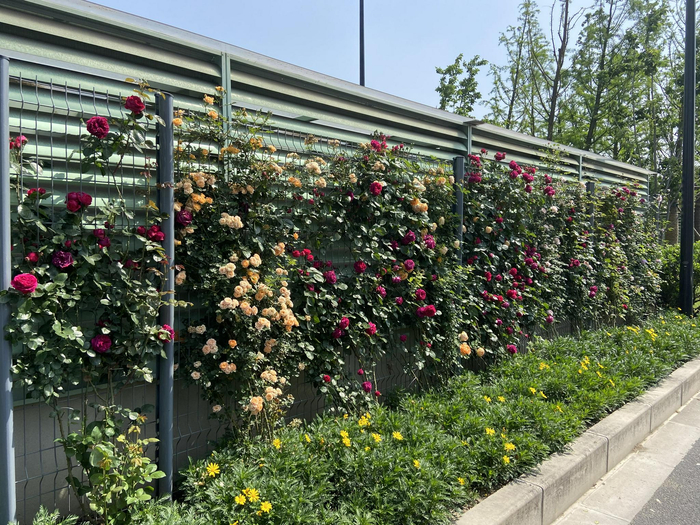 栾树、落羽杉、日本早樱、鸡爪槭、紫薇、鼠尾草、樱花、八仙花、月季……丰富的植物出现在长宁区北翟路。从广顺北路到剑河路,该路段路长2100米,隔离带和两侧绿地里花叶缤纷,甚至在中央隔离带通风井四周还混合种植了藤本月季,并于两侧底部配合种植了黄金菊、鼠尾草。从3月到10月,这里都是一道漂亮的风景线。