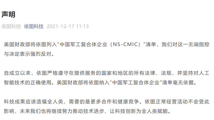 依图科技发布声明称,自成立以来,依图严格遵守在提供服务的国家和地区的所有法律、法规,并坚持对人工智能技术的正确使用。美国财政部将依图纳入“中国军工复合体企业”清单毫无依据,公司对这一无端指控与决定表示强烈反对。依图正常经营活动不会受此影响。