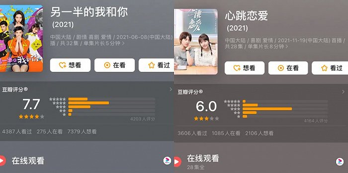 值得一提的是,平台在今年推出的《另一半的我和你》《心跳恋爱》不仅形成了一定的出圈效果,还取得了较为亮眼的口碑成绩,前者更一度以8. 1的豆瓣评分刷新了国产微短剧的观众口碑。