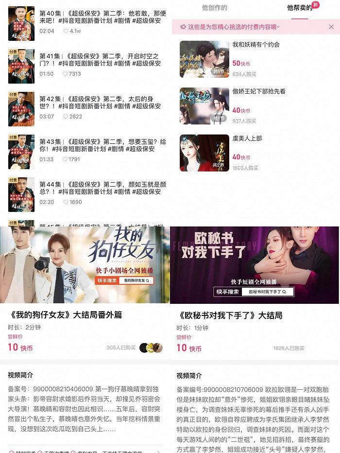 对比免费播放的前40集,抖音微短剧《超级保安》第二季需要付费解锁的41-45集播放量皆呈现断崖式下滑,最高不过7000出头。无独有偶,《我和妖精有个约会》《我的狗仔女友》欧秘书对我下手了》等快手目前热度与好评率较高的几部付费微短剧,付费效果也难令人违心夸赞。