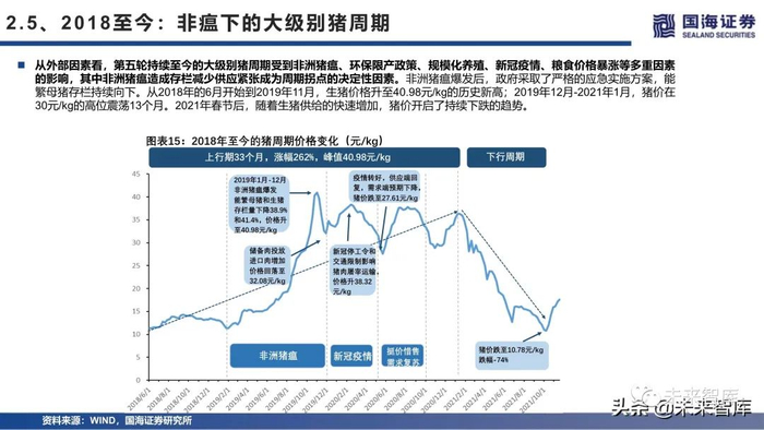 从外部因素看,第五轮持续至今的大级别猪周期受到非洲猪瘟、环保限产政策、规模化养殖、新冠疫情、粮食价格暴涨等多重因素 的影响,其中非洲猪瘟造成存栏减少供应紧张成为周期拐点的决定性因素。非洲猪瘟爆发后,政府采取了严格的应急实施方案,能 繁母猪存栏持续向下。从2018年的6月开始到2019年11月,生猪价格升至40.98元/kg的历史新高;2019年12月-2021年1月,猪价在 30元/kg的高位震荡13个月。2021年春节后,随着生猪供给的快速增加,猪价开启了持续下跌的趋势。