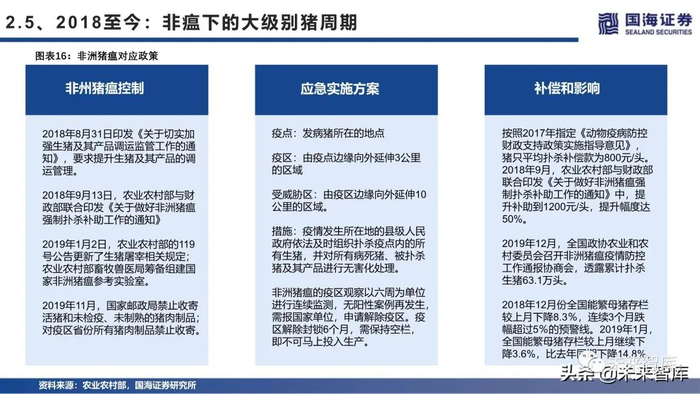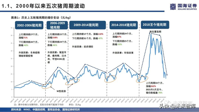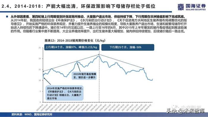 ③2009-2014年猪周期,生猪价格上涨27个月,涨幅+111%,下跌32个月,跌幅-47%,最高单周平均猪价达到19.9元/千克。本轮周 期受到的外生性干扰较少,是相对经典的猪周期,价格主要受供需矛盾推动。