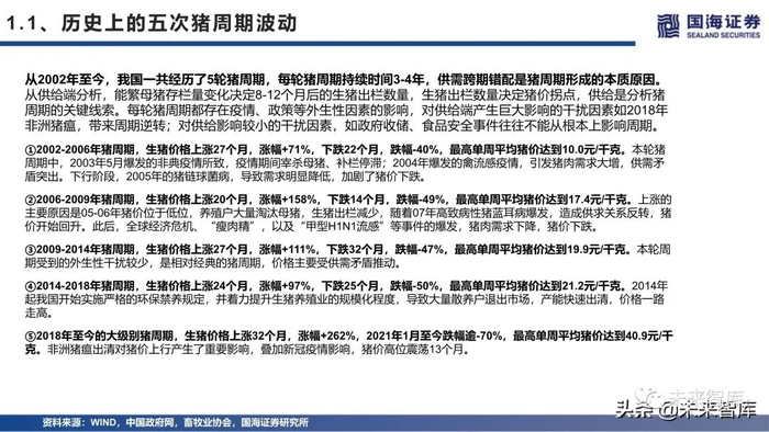 生猪供给是猪价变化的主要驱动因素。过去五轮上涨猪周期,均由于前一年能繁母猪存栏下降导致一年后生猪供给减少驱动;过去4轮和本轮下行猪周期,除2016-2018年能繁母猪存栏下降(环保政策),主要均由于前一年能繁母猪存栏增加导致一年 后生猪供给增加驱动。生猪价格低点由养殖成本决定,最近两轮猪周期猪价底部均为10元/公斤左右。(报告来源:未来智库)