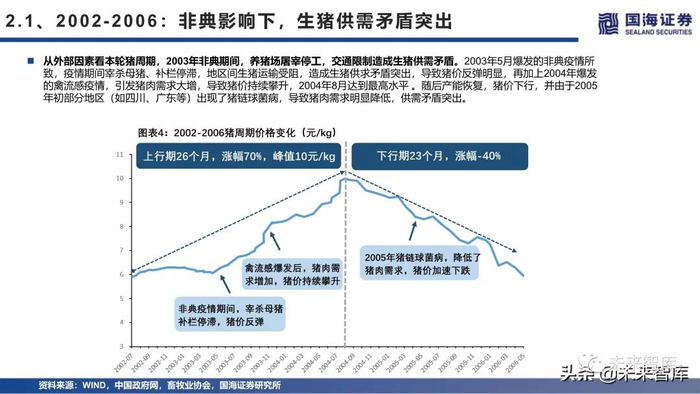 ①2002-2006年猪周期,生猪价格上涨27个月,涨幅+71%,下跌22个月,跌幅-40%,最高单周平均猪价达到10.0元/千克。本轮猪 周期中,2003年5月爆发的非典疫情所致,疫情期间宰杀母猪、补栏停滞;2004年爆发的禽流感疫情,引发猪肉需求大增,供需矛 盾突出。下行阶段,2005年的猪链球菌病,导致需求明显降低,加剧了猪价下跌。
