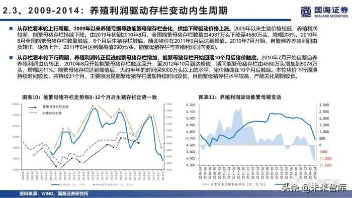 从存栏看本轮上行周期,2009年以来养殖亏损导致能繁母猪存栏去化,供给下降驱动价格上涨。2009年以来生猪价格较低,养殖利润 较差,能繁母猪存栏持续下降。由2019年初到2010年8月,全国能繁母猪存栏数量由4987万头下降至4580万头,降幅达8%。2010年 8月全国能繁母猪存栏数量触底,8个月后生猪存栏触底,随即猪价在2011年9月后达到峰值。2010年7月开始,自繁自养养殖利润由 负转正,逐渐上升,2011年6月达到最高值690元/头,能繁母猪存栏与养殖利润同向变动。(报告来源:未来智库)