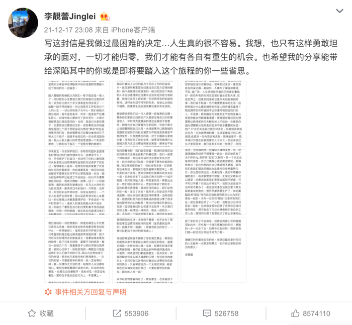 12月17日深夜,王力宏前妻李靓蕾微博发文近4000字,迅速引发舆论关注。