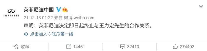12月18日凌晨,英菲尼迪中国官微发布声明称,英菲尼迪决定即日起终止与王力宏的合作关系。