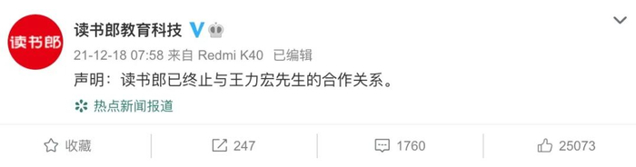 12月18日早上,读书郎教育科技在其官方微博发布声明:已终止与王力宏的合作关系。