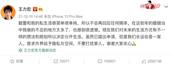 就在两天前,12月15日,知名艺人王力宏提出离婚申请,8年婚姻生活划上句号。
