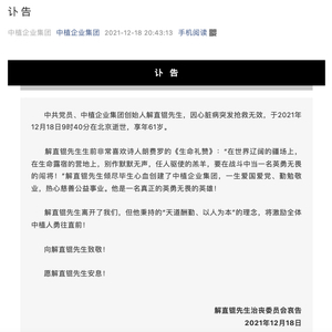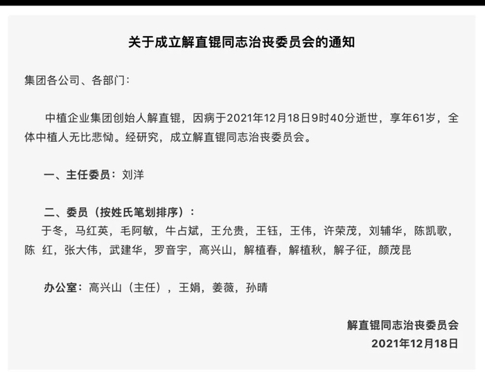 12月18日,中植企业集团在官微发布讣告:集团创始人解直锟因心脏病突发抢救无效,于当日9时40分在北京逝世,享年61岁。