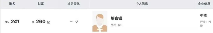 胡百富榜,解直锟以260亿身家位居241名。