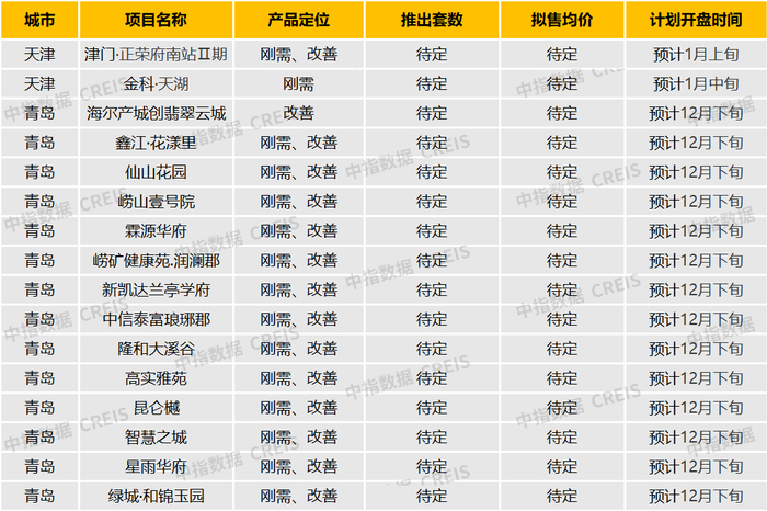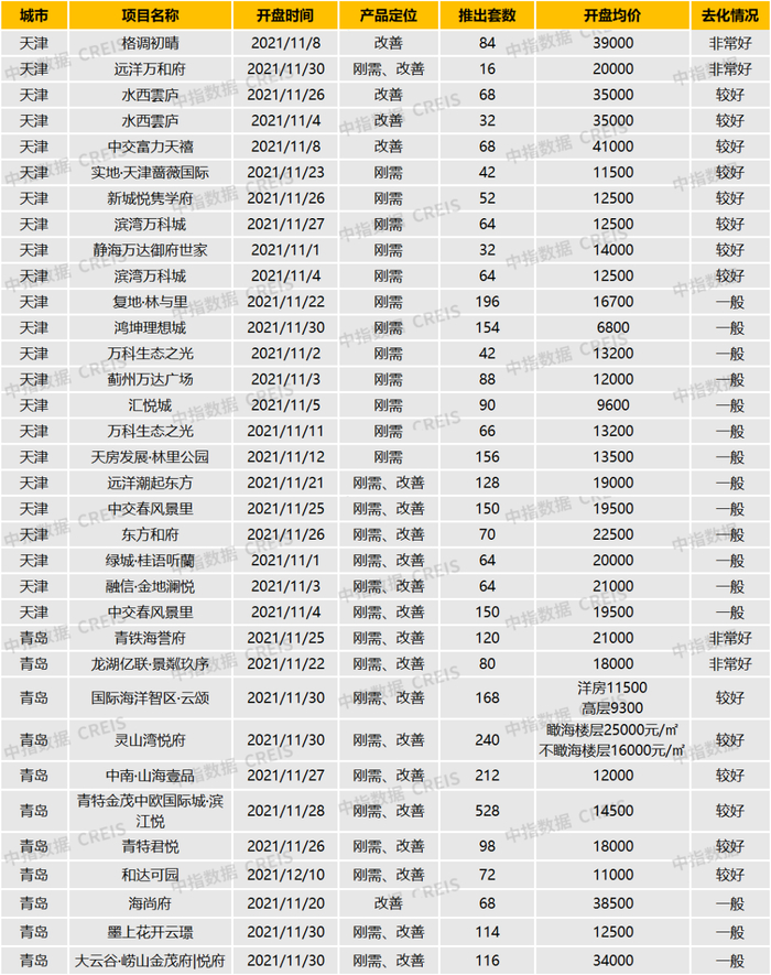 根据中指数据CREIS监测,2021年11月-12月,华北大区重点城市天津、青岛两个城市累计开盘34个,共推出3756套,其中,纯新盘项目占比30%,刚需改善项目占比85%,刚需产品热销。天津的格调初晴、青岛的青铁海誉府等项目由于品牌地产口碑、区位优势及配套完善等原因实现开盘热销。