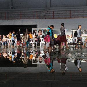 当地时间2021年12月17日,菲律宾尼格罗斯西部省伊莎贝拉镇,居民们到达一个文化中心以躲避超级台风“雷伊”。